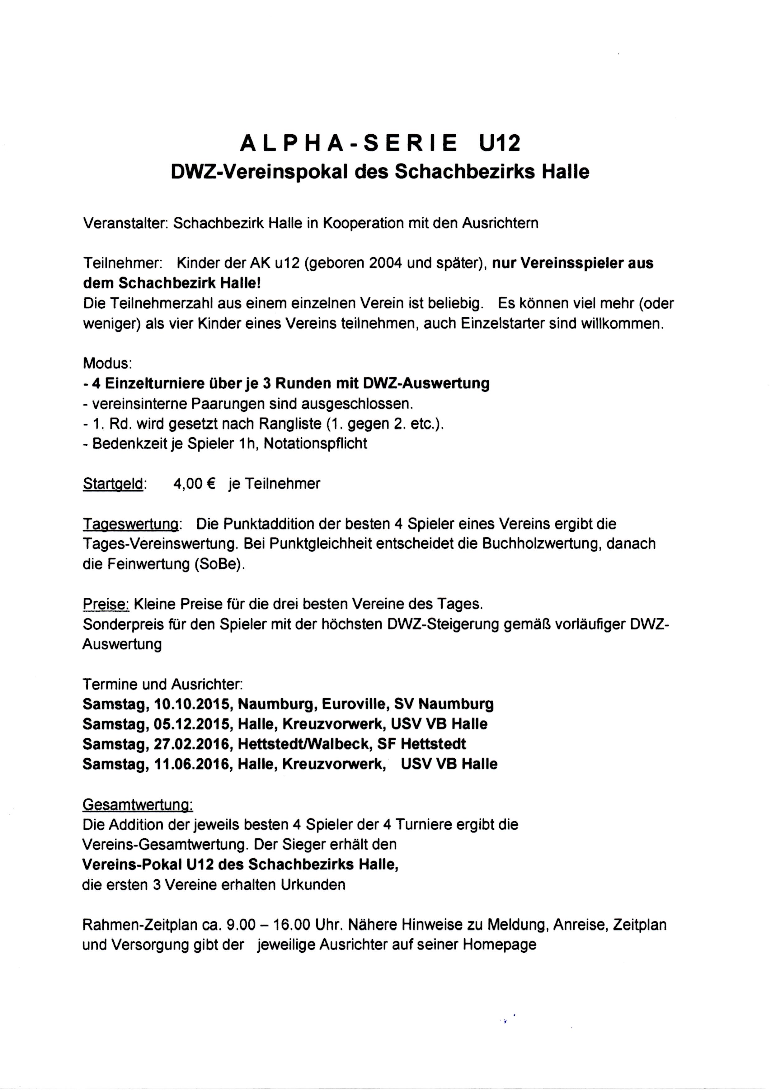 Das 2.Turnier der Alpha-Serie u12 findet am 5.12.2015 in Halle, Kreuzvorwerk statt. Ausschreibung beiliegend.